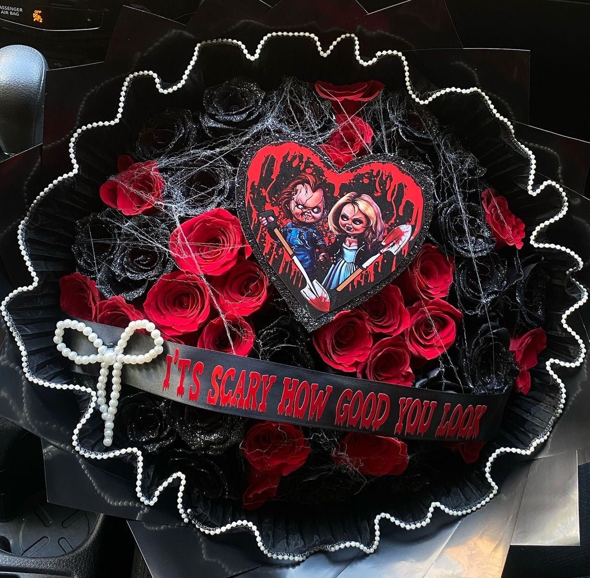 Inspired by everyone’s favourite murderous duo, a striking red-and-black arrangement that blends horror with passion. Perfect for spooky-season lovers.