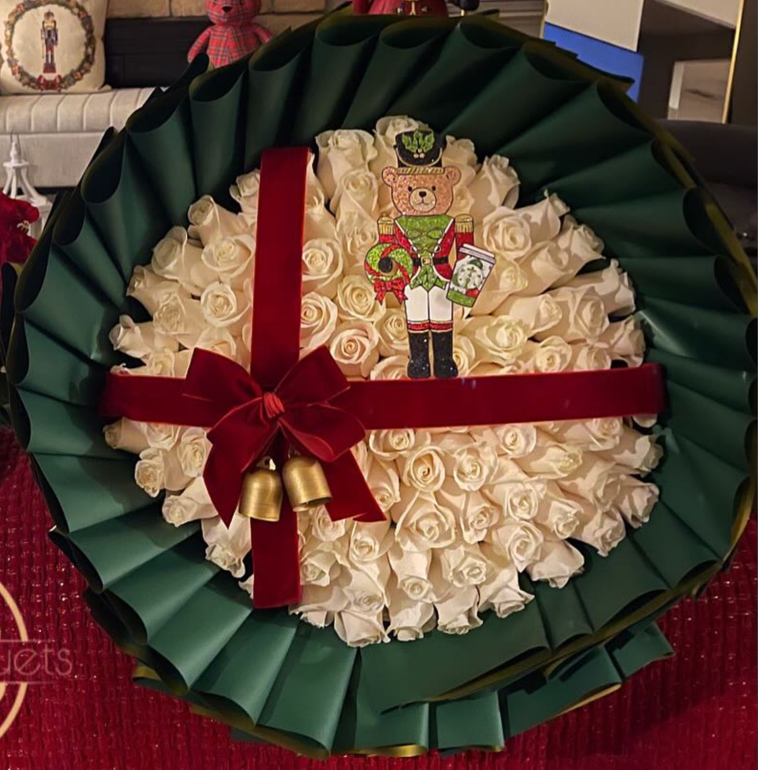 Classic elegance meets Christmas magic β a bouquet of creamy roses wrapped in deep green with a velvet bow and a charming nutcracker bear in center stage. πβ¨π