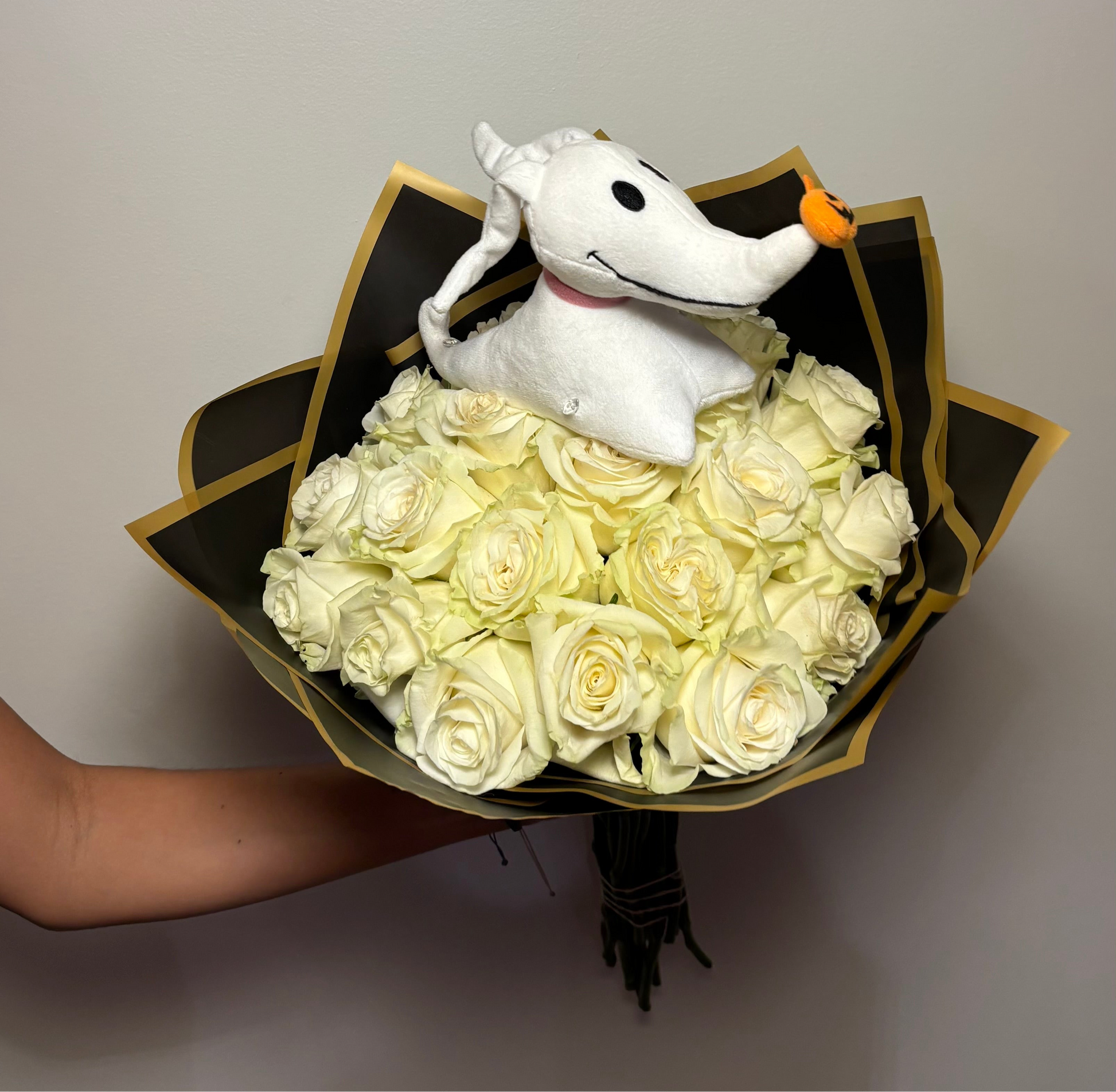White roses topped with a plush ghost-dog friend from a beloved spooky classic. Perfect for fans of whimsical gothic style or anyone who loves a cute yet eerie surprise.
